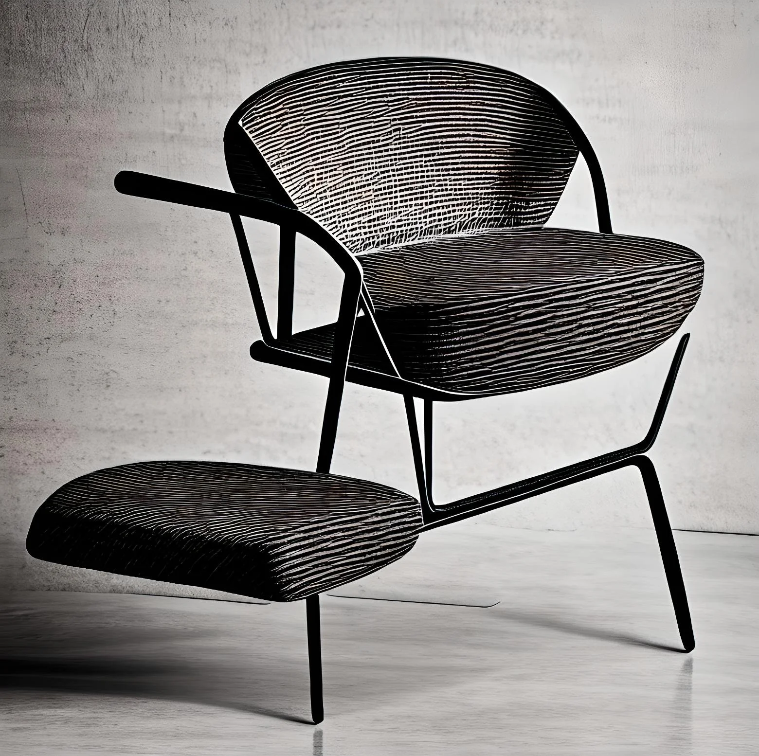The chair design is a true masterpiece that embodies the spirit of the movement pattern and illusion, inspired by the pioneering work of Loie Fuller in textile and light studies. The chair features a sleek and minimalist design that pushes the limits of the human form, creating a sense of fluidity and motion. The frame of the chair is constructed from chrome-plated steel, meticulously crafted to achieve a seamless and uninterrupted flow of lines. The steel frame forms a sturdy yet elegant base, providing stability to the chair while also serving as a visual element that complements the overall design. The seating and backrest of the chair are made from a combination of translucent and opaque textiles that are carefully woven together to create a mesmerizing illusion of movement. The textiles are designed to mimic the swirling and undulating patterns of fabric in motion, inspired by Loie Fuller's work in dance and textile studies. The interplay of light and shadow on the textured textiles creates a captivating visual effect that adds depth and dimension to the chair. The chair's ergonomic design is optimized for comfort, with the textiles conforming to the contours of the human body, providing a seamless and supportive seating experience. The chair's backrest gently curves to follow the natural shape of the spine, promoting proper posture and comfort during extended periods of sitting.
